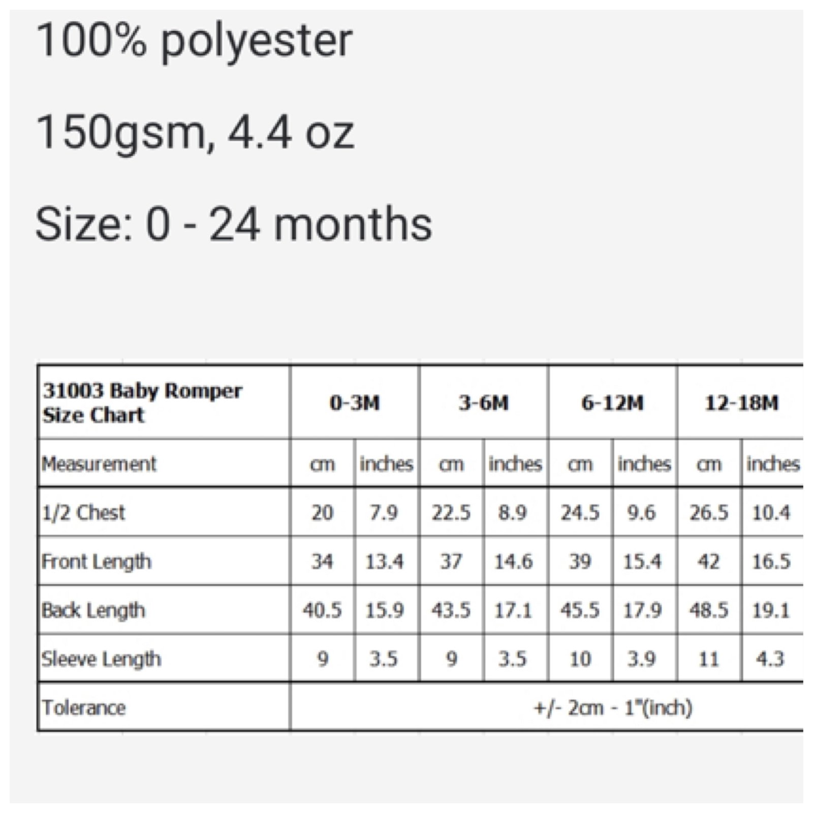 Sublimation printed designs on polyester, onesies are size 1 and below and are quite a generous make, tee’s go up by 2 from size 2, please refer to size chart for correct sizing measurements